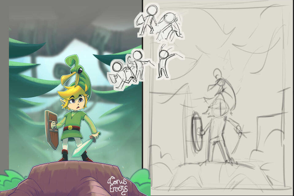 Clean piece, from thumbnail to finished.Alterations: Sketch phase only.